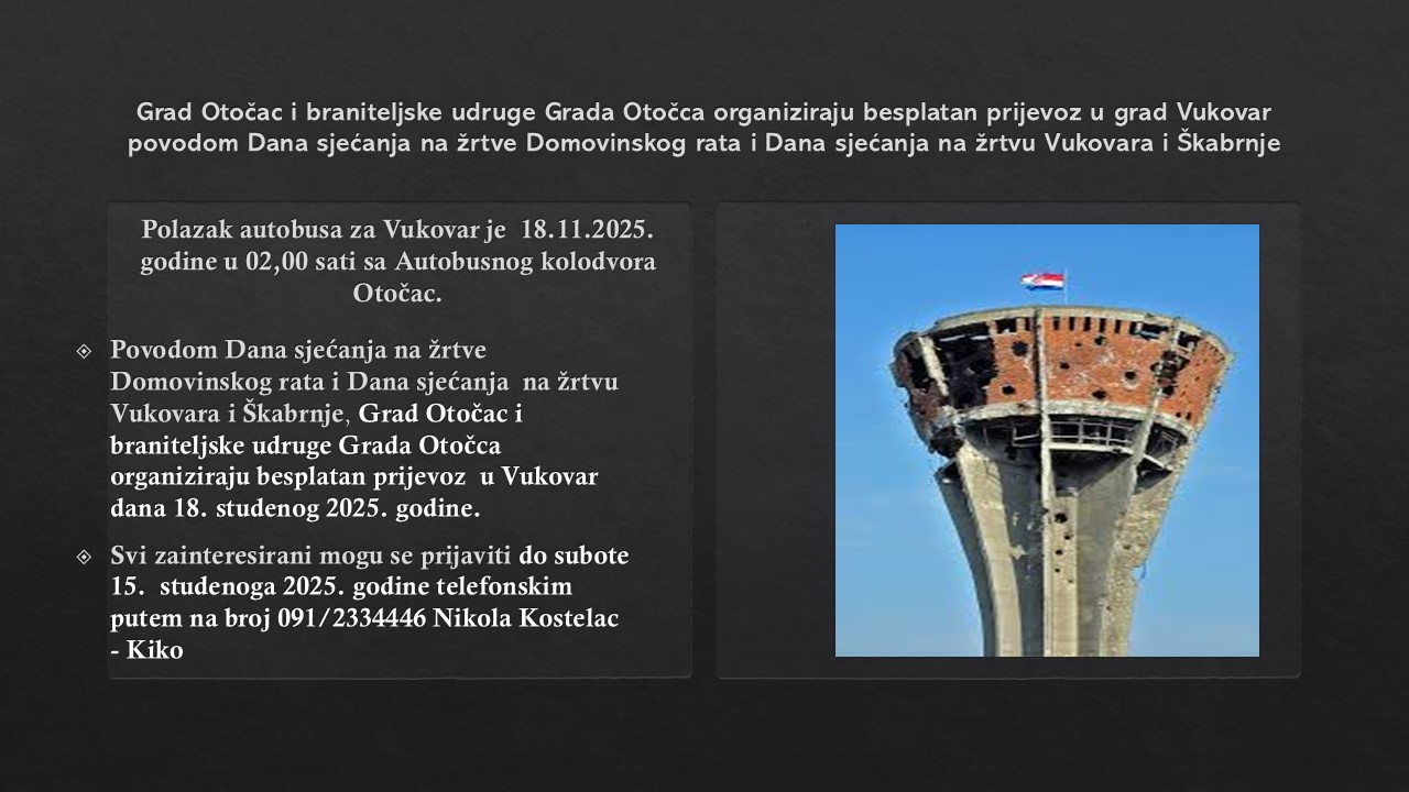 Grad Otočac i braniteljske udruge Grada Otočca organiziraju besplatan prijevoz u grad Vukovar povodom Dana sjećanja na žrtve Domovinskog rata i Dana sjećanja na žrtvu Vukovara i Škabrnje.